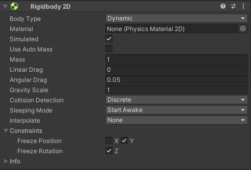 A Rigidbody 2D component places an object under the control of the physics engine. There is a Rigidbody 3D, the differences are that in 2D, objects can only move in the XY plane and can only rotate on an axis perpendicular to that plane, compared to Rigidbody 3D, which will have a Z plane.