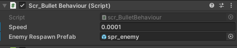 The Bullet C# Script will contain how fast the GameObject will go as soon as it spawns and will have Enemy Respawn Prefab so when the bullet hits the Enemy GameObject, it will destroy it and recreate a new one back at the top of the screen.
