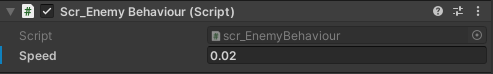 The Enemy C# Script will contain the speed of how fast it will drop down the screen to get past the Player and how the Enemy will respawn after being touched by the Bullet GameObject.