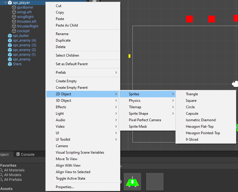 Our Player is going to be more than just a Square, so we can group multiple objects under one entity. This makes all shapes seem like one, making it look like a Space ship