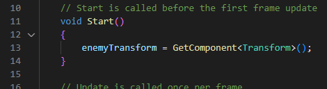 We did run into a problem with the enemy spawning and then when destroyed won’t respawn. Turns out there was a misspells on two lines of code, which it was Line 11 and 13. It used to be void sart(): for 11 and GetCompnent<Transform>(): on 13, when it should be void Start(): for 11 and GetComponent<Transform>(): for 13. Correct line of code is shown above.