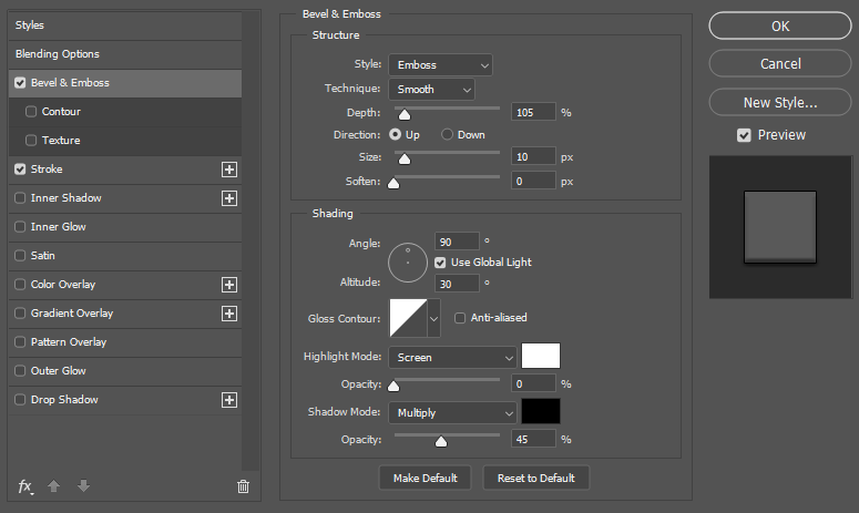 Now I want to give my button a bit more shape to It, I clicked on the ‘fx’ button and then click on ‘Bevel and Emboss’, this will open a little tab to mess with the shape of the button. Now you can change the Shape, Depth, Shading, Type, Style and Structure of the button to what you want it to be like for you use.