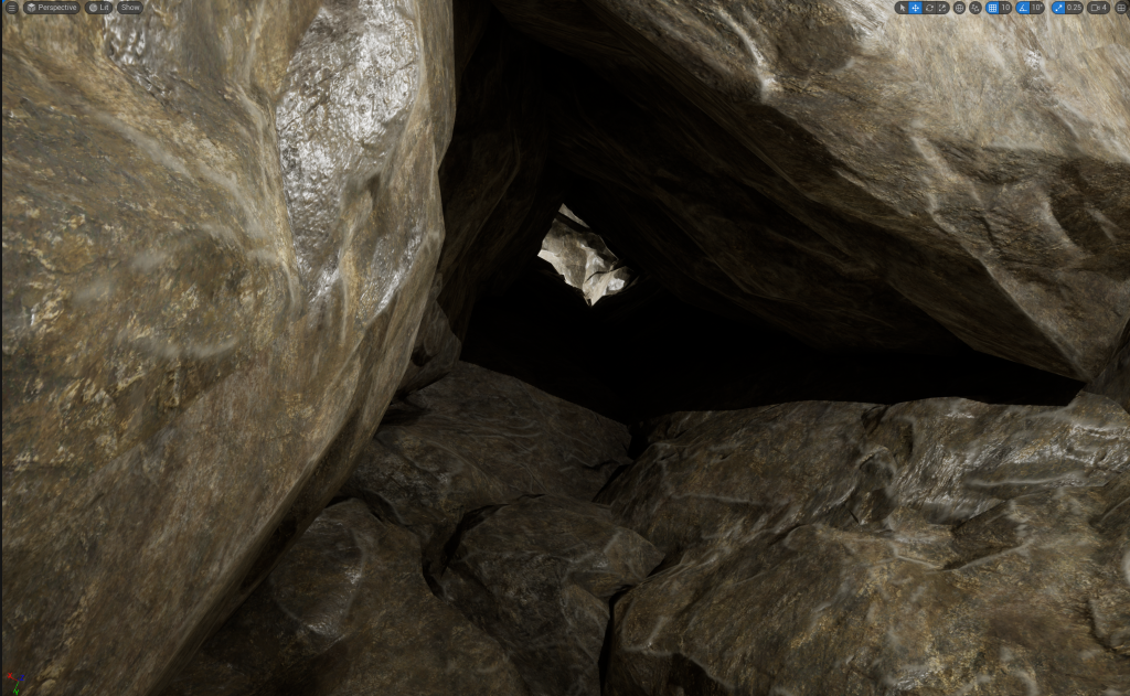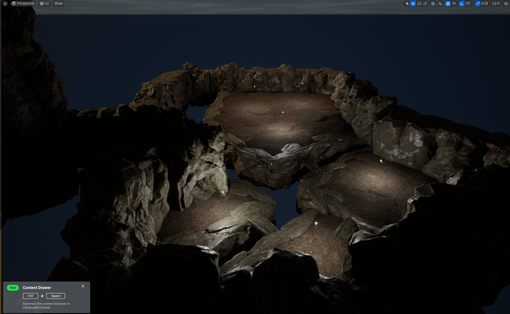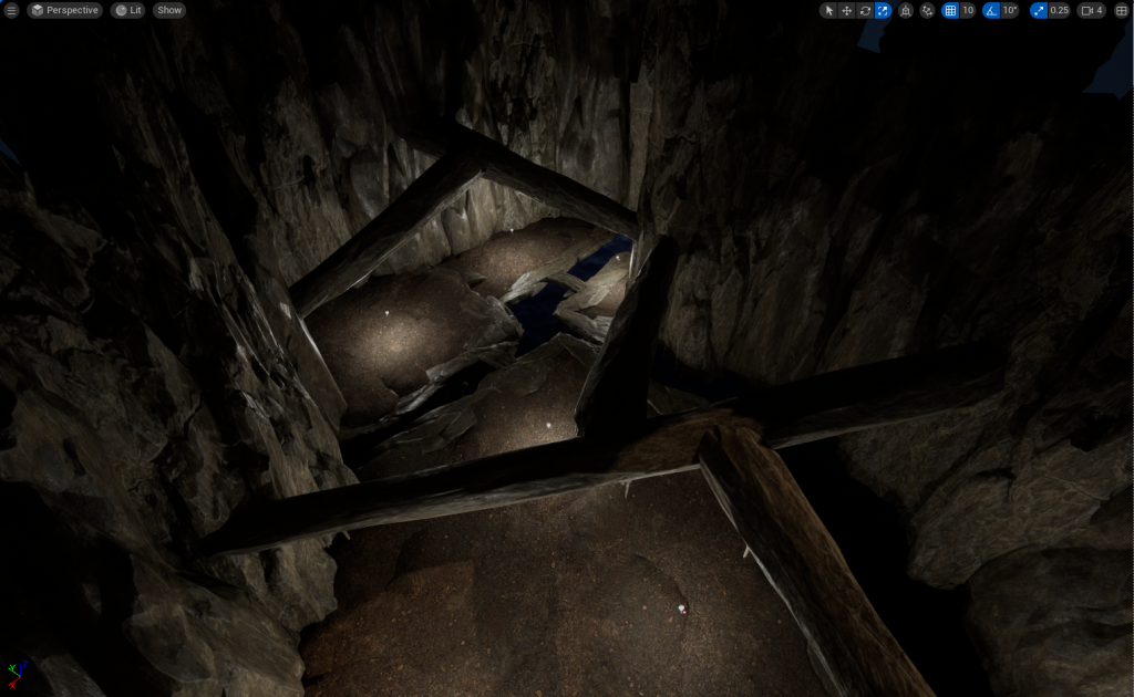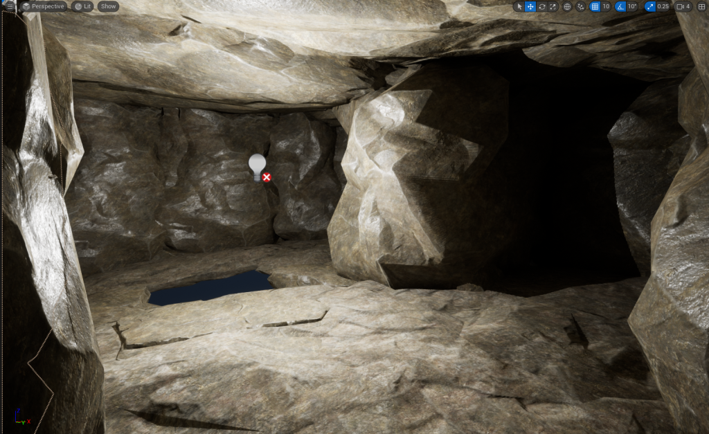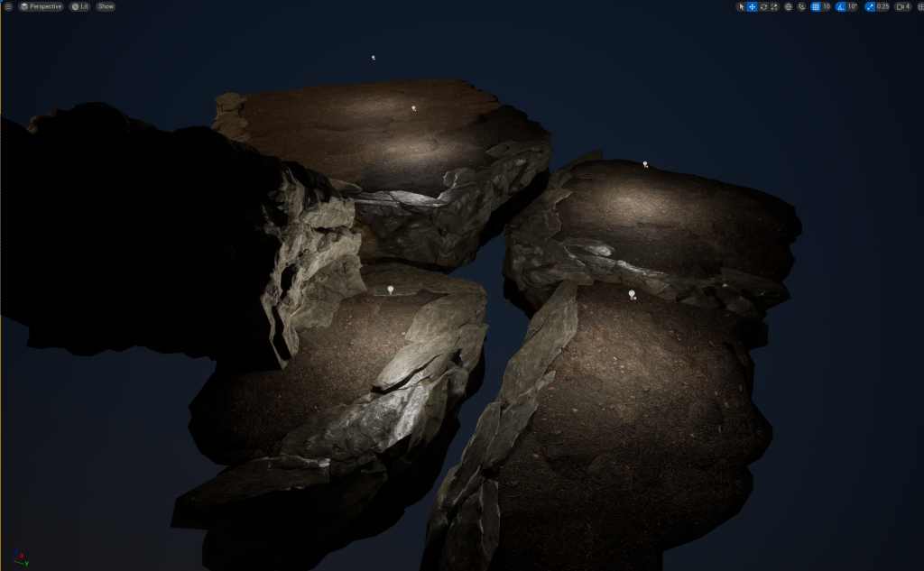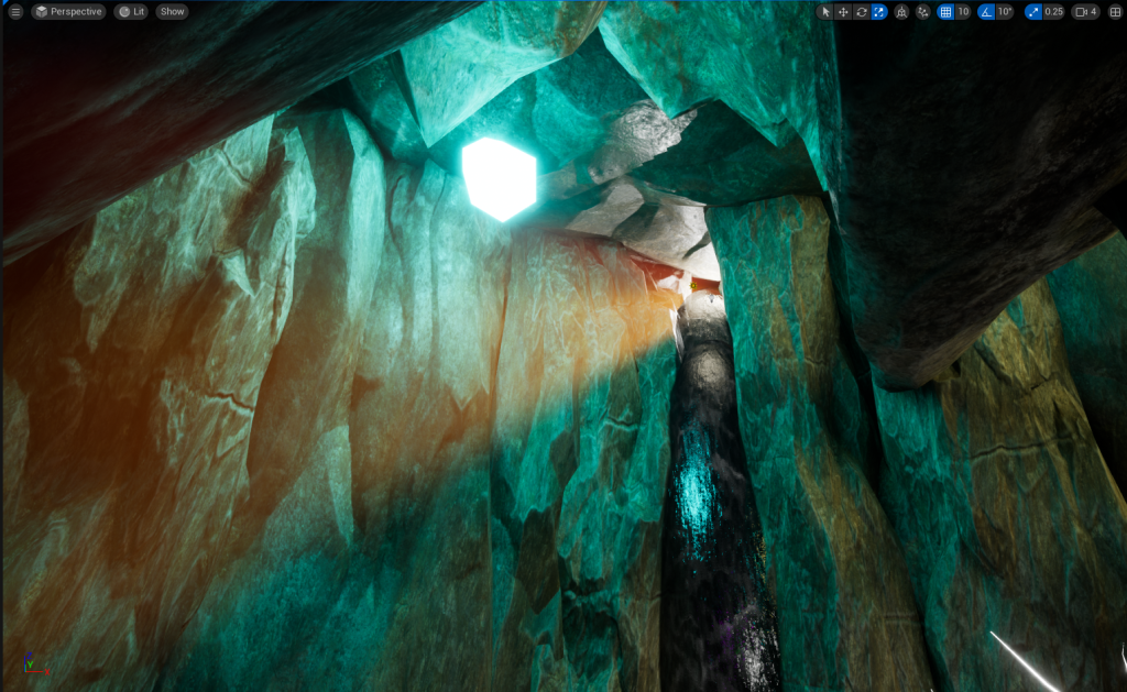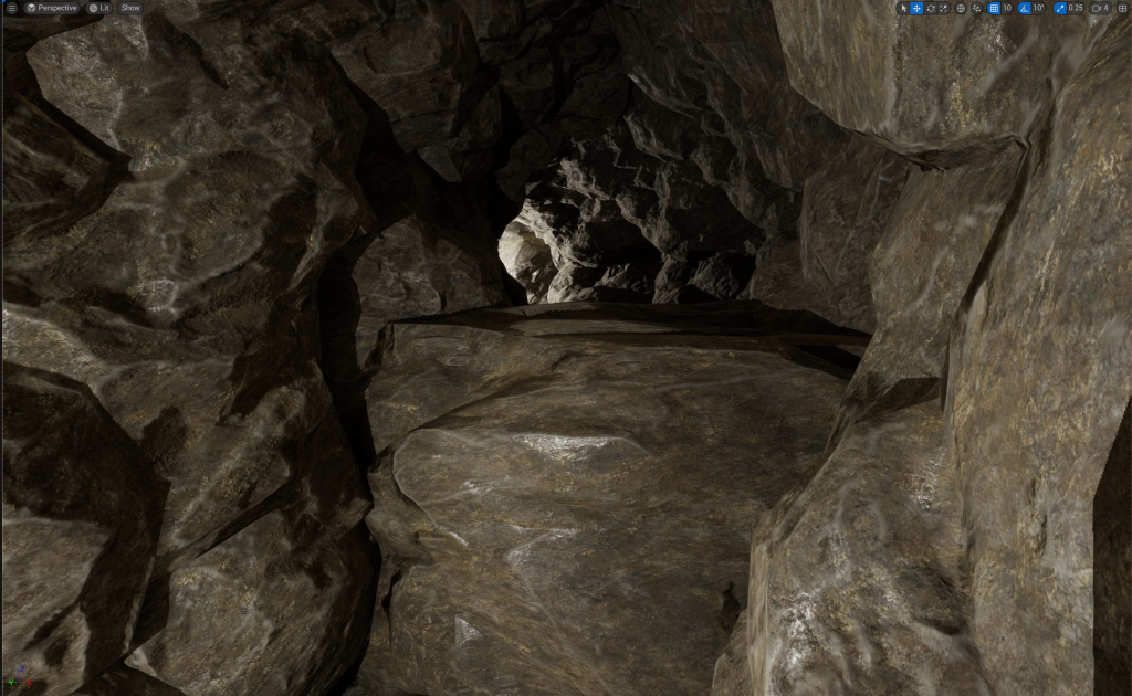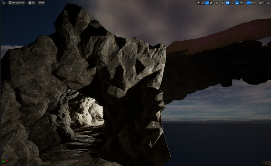 With the wall height being increased, I decided to add Pillars that will stick out of the wall. Later, I will added in Spike or Stalactites onto the Pillars to give off a more natural vibe to the cave and make anyone go through with caution because the Spike or Stalactites could potentially fall (Not really, there is no animations for it and I don’t plan to add that in my environment)