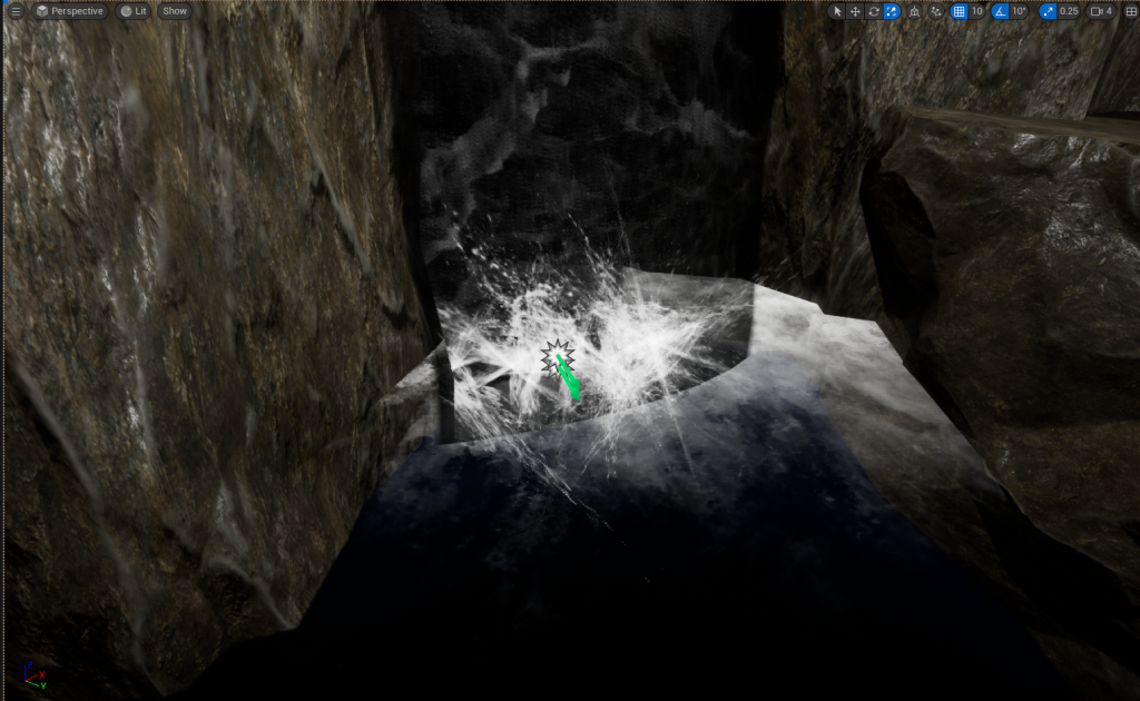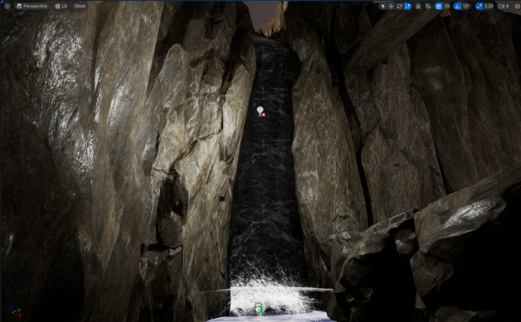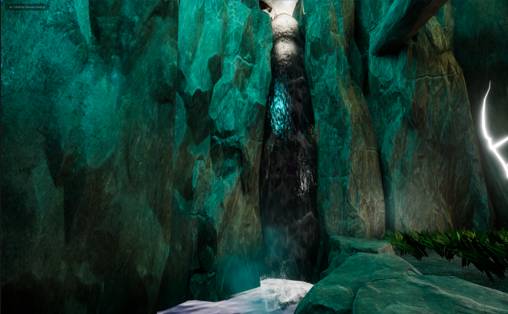 I Added in a Waterfall Prop so then there is a reason for how there is water in the Main Cave area. Particles effects were added at the bottom of the Waterfall to make it more realistic. Splashing, ripples and Steam was used to add the effect of a real waterfall and