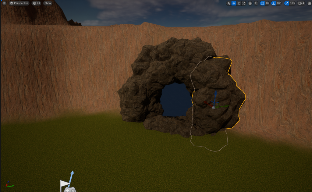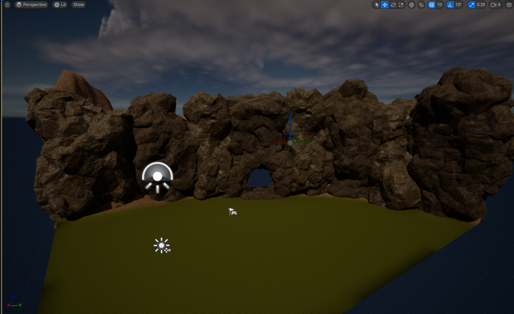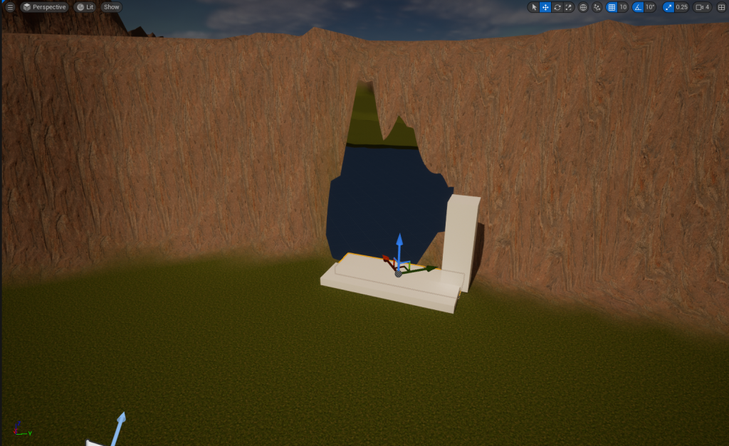 Just with a few shapes, I will make a rough estimate of how big the Cave’s Entrance will be and then cover the rest of the cliff with stone/cliff props to help blend in with the Cave’s Entrance and Environment.