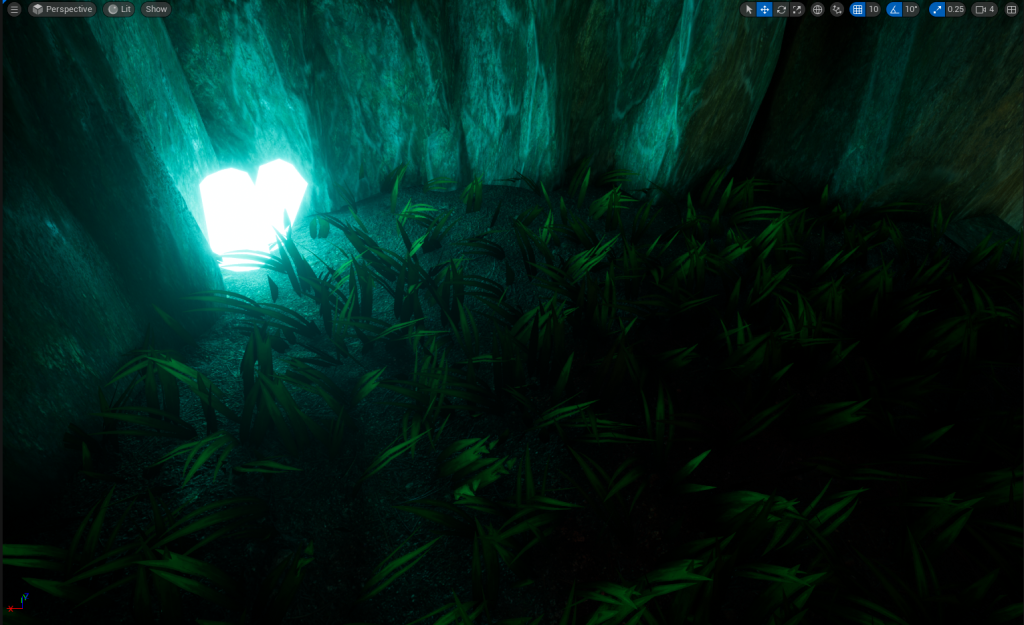 Making the Emissive Materials and Making the Crystals the light source for the Main Cave Area and the Tunnel was a Great Idea. Having my light source mostly glowing Blue was a nice touch, especially with the Grass, River and Waterfall.