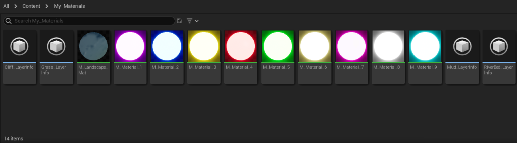 The Materials I have created, most are emissive (Glowing) Materials