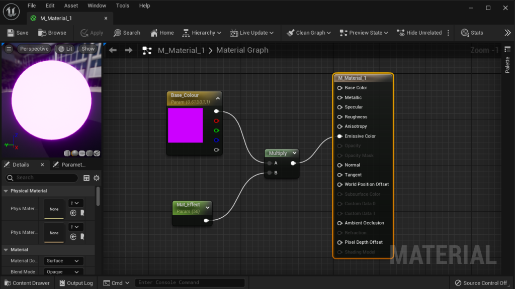 The Material Blueprint Map consist of the Base Colour, I picked purple for my first Emissive Colour. Mat Effect, this changes depending on the channel you link it to, for Emissive Colour, It increases the radius of the Glow effect on the Material.