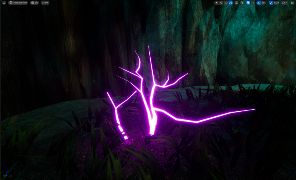 With My Material 1 Finished, I can now apply this to any Prop/Asset that is placed within my Environment. Now with my 9 Colours, I have made multiple Glowing Trees, dotted around my Main Cave Area. There is no Glowing Trees in the Tunnel because I want the Main Cave Area to be eye catching.
